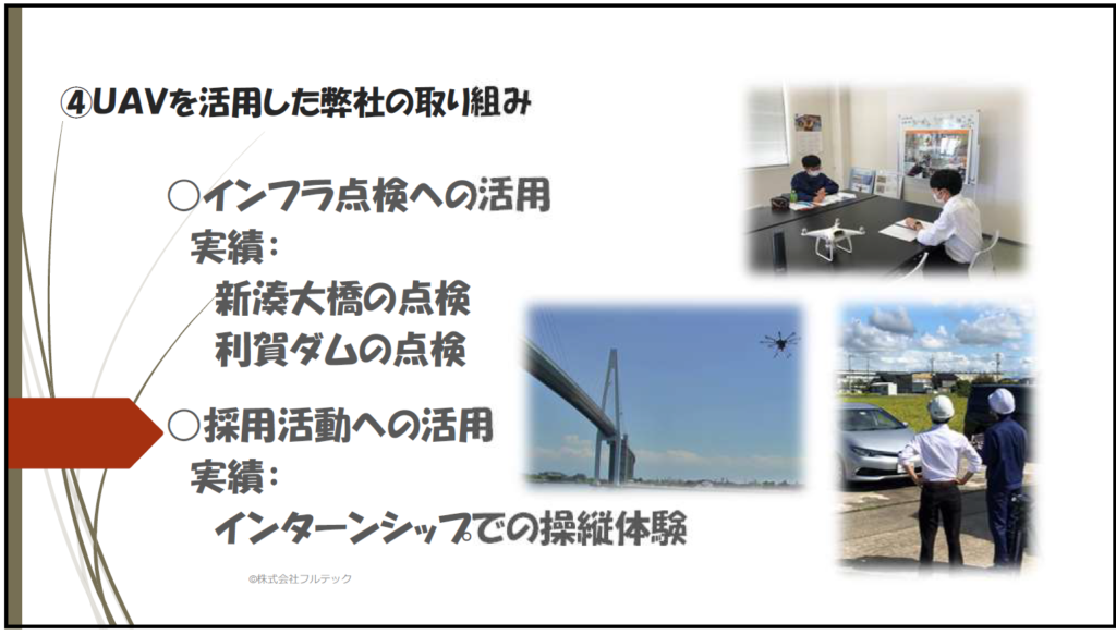 令和5年2月6日及び20日に開催された建設コンサルタンツ協同組合の講習会にて、古村会長が講師を務めました。 UAV(ドローン)の活用状況やUAV導入の際の知識等について講演しました。
