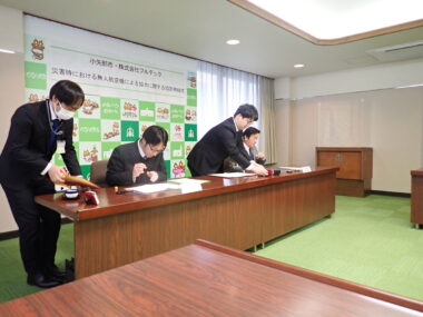 令和5年12月1日(金)、小矢部市と株式会社フルテックとの「災害時等における無人航空機による協力に関する協定」締結式が開催されました。締結式には、小矢部市長 桜井 森夫 様と弊社社長の古村が出席し、協定書への調印を行いました。