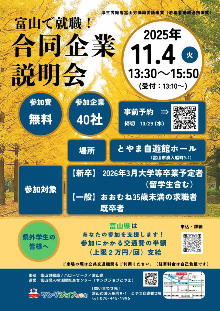 11月4日(火)にとやま自遊館ホールで開催される「【26卒・一般対象】富山で就職!合同企業説明会」に参加します。